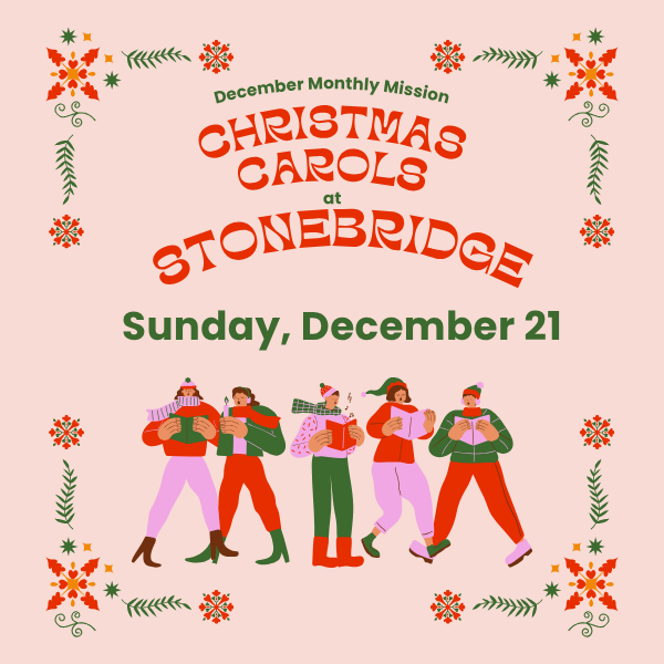 Join us to spread cheer for all to hear! We’ll sing Christmas Carols to the residents at Stonebridge after service on December 21 for our Monthly Mission.